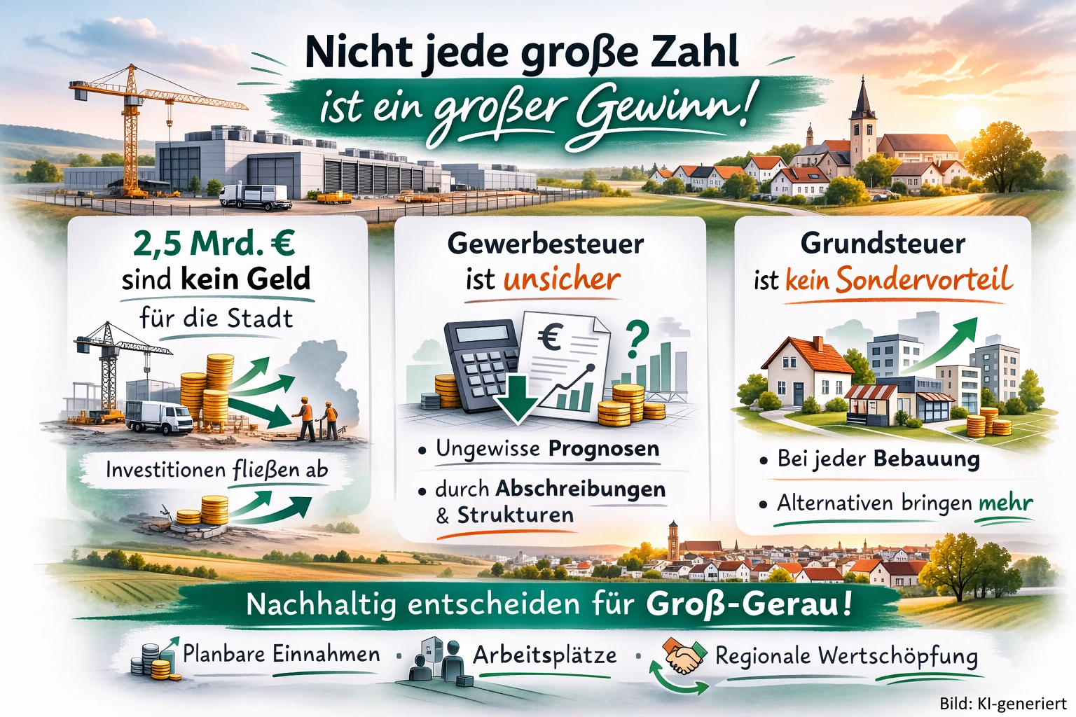 2,5 Milliarden Euro Investitionssumme – diese Zahl klingt gewaltig. Sie vermittelt den Eindruck, als würde ein finanzieller Schatz nach Groß-Gerau fließen. Doch bei genauer Betrachtung zeigt sich: Diese Summe beschreibt in erster Linie Bau- und Ausrüstungskosten des Investors – nicht Einnahmen für unsere Stadt.
